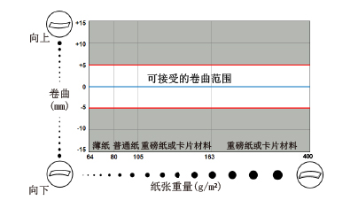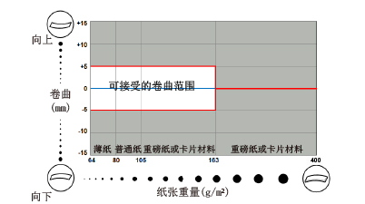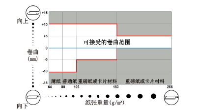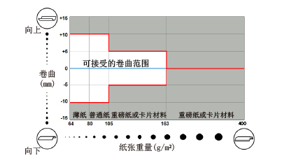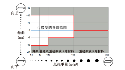 如果输送纸张的重量在106到163 g/m2,建议使用向上卷曲量在10 mm或以下,或向下卷曲量在5 mm或以下的纸张。