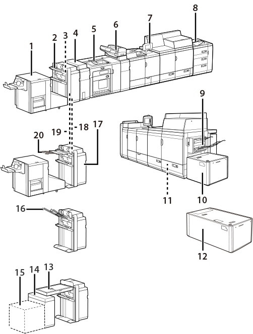 20. | 分页器加长纸出纸托盘-A 分页器加长纸出纸托盘-A 已安装到 分页装订处理器-AN/鞍式分页装订处理器-AN。纸张在输送方向上的长度大于 762 mm 时可使用此部件。纸张短于 762 mm 时可以添加最多 300 张纸,长度为 763 mm 到 1,300 mm 时,可添加 10 张。 |