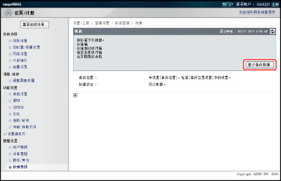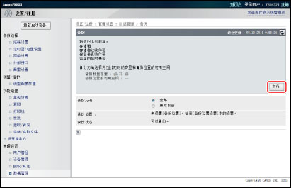 有关保存的数据的基本信息,请参阅 “扫描后存储” 和 “存取已存储文件”。 建议定期备份重要数据。 确保不要编辑或删除备份的数据。如果编辑备份的数据,可能无法正确备份或恢复数据。 要备份/恢复已存储数据,必须以管理员身份登录。 |