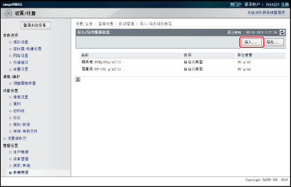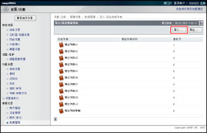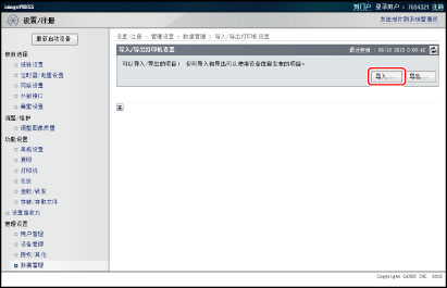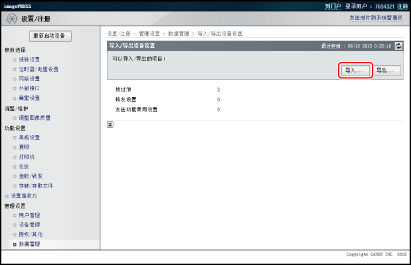 如果导入设备设置,会同时导入“地址列表”,从而会使已注册的接收方被删除或被导入的文件中的接收方覆盖。 必须重新启动本机才能启用导入的设备设置。导入后,关闭本机主电源,然后重新打开主电源。 导入设备设置后,必须重新启动本机才能使用“远程用户界面”执行其他操作。关闭本机主电源,然后重新打开主电源。 如果从本机导出的数据导入到不同型号的机器,则不会更新操作面板上的 [常用设置]。 如果指定“远程地址簿”中的地址作为转发接收方,则不会导入转发设置。但是,如果导出设置信息的机器和导入的目标机器使用相同的“远程地址簿”,则可在导入的目标机器中使用转发设置。有关“远程地址簿”的详细信息,请参阅 (请参阅“使用地址簿指定接收方(远程)”) |