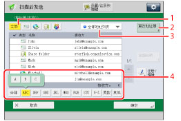 1 | 指定接收方类型按钮 按 [全部]、 (电子邮件)、 (互联网传真)、 (文件)或 (群组)显示在每个类型中注册的接收方。 |