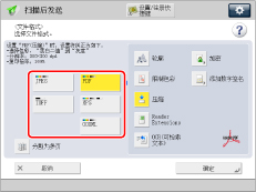 如果以PDF、XPS或OOXML格式发送,可以选择附加设置。有关设置PDF、XPS或OOXML各类型的说明,请参阅以下内容: [轮廓]:轮廓 [压缩]:压缩 PDF 或 XPS [限制色彩]:限制色彩 PDF [OCR(可检索文本)]:可检索 PDF/XPS/OOXML [添加数字签名]:为 PDF 或 XPS 添加数字签名 [加密]:加密 PDF 文件 |