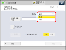 <彩色接收>: | 指定接收方是否支持以彩色接收。 如果接收方支持以彩色模式接收,按 [打开] → [下一步] → 设置纸张尺寸和分辨率。 如果接收方不支持以彩色模式接收,按 [关闭] → 设置纸张尺寸、压缩方法和分辨率。 |