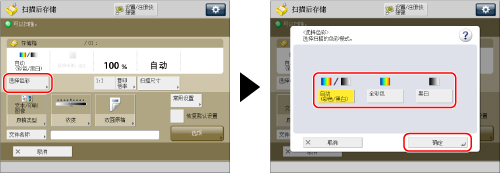 如果黑白原稿以“全彩色”模式扫描,将视作彩色扫描。 通过更改默认扫描设置可以将所需色彩模式注册为默认设置。(请参阅“指定扫描后存储设置”) |