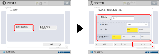 如果已禁用设备签名,则不必按 [生成网络通信密钥]。如果按 [生成密钥],则屏幕更改为生成网络通信密钥的屏幕。