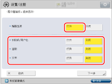 [关闭]: | 可以选择 [全表面打印] 或 [5个位置的编号]。 文本尺寸可以选择 [12.0点]、[24.0点] 或 [36.0点]。 |
