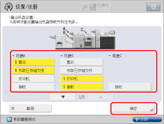 可以为多个功能指定一个输出托盘。 输出接收方的优先级顺序取决于所选输出托盘的顺序。优先级显示为“1”和“2”。 如果“大容量堆叠模式”设为“打开”,则托盘 B 的输出顺序将被设为“1”,因此无法更改托盘 B 的优先级。但在安装了“大容量堆叠器-H”时,如果将托盘 C 的输出顺序设为“1”,则优先级给予托盘 C。(请参阅“大容量堆叠模式”) |