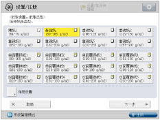 如果详细设置列表中未显示添加纸张的纸张类型,可以注册纸张类型。有关注册纸张类型的说明,请参阅 “功能概述”。 为供纸器注册自定义纸张类型时,纸张类型设置会处于保护状态并且无法在“设置/注册”下 [参数选择] 的[纸张类型管理设置] 中更改自定义纸张类型的详细信息或删除自定义纸张类型。 |