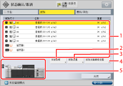 (状态确认/取消) 时,会出现“状态确认/取消”屏幕。可以在此屏幕上更改作业顺序、取消作业,以及确认作业状态和作业日志的详细信息。也可以获取耗材的详细信息。