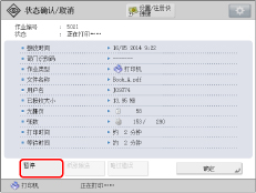 如果选择打印作业并按 [详细说明],按 [纸张输送] 可以强行打印存储器中剩余的打印数据,按 [略过错误] 可以暂时禁用错误并继续打印。[纸张输送] 和 [略过错误] 只能用于从计算机发送的打印作业。 如果作业发布时指定的纸张不可用,则会出现一条信息要求添加合适的纸张。装入纸张,然后重新开始作业。如果“设置/注册”下 [功能设置] 中的 [已中止的作业超时] 设置为“打开”,则由于没有可用于打印的纸张而中止的作业在超过指定的时间后会显示为已中止的作业。要重新开始打印已中止的作业,添加纸张 → 选择作业 → 按 [详细说明] → [重新开始]。 |