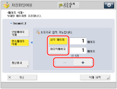 [시작 페이지] 및 [마지막페이지]를 누르고 → [-] 또는 [+]를 사용하여 삭제할 처음과 마지막 페이지를 지정합니다.