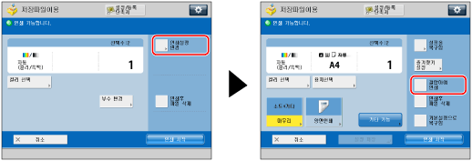 Document Insertion Unit-N에서 용지를 급지하기 전에, 용지를 Document Insertion Unit-N에 넣고 용지 크기를 지정합니다. Document Insertion Unit-N에서 용지를 급지하려면, [인서터 1] 또는 [인서터 2]를 선택합니다. 현재 작업에 대해 용지가 Document Insertion Unit-N에서 급지 중인 경우 [인서터 1 변경] 또는 [인서터 2 변경]을 누르고 구분 종이에 사용할 용지를 선택합니다. |