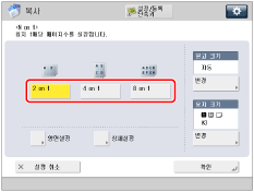이 모드를 사용하여 용지 한 장에 배열되도록 스캔된 여러 장의 원고나 양면 원고를 출력할 수 있습니다. 2, 4 또는 8개 스캔 원고를 선택하여 페이지에 배열할 수 있습니다. 또한 양면 복사본을 설정하고 이미지의 레이아웃 및 순서를 변경할 수도 있습니다.
