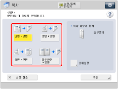 양면]을 누릅니다.[좌우페이지 양면]: | 책이나 제본된 원고의 펼쳐진 페이지를 용지 한 장의 앞면 및 뒷면에 복사합니다. |