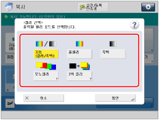 [자동 (컬러/흑백) 사용]이 [복사의 컬러 선택 설정]에서 '해제'로 설정된 경우, [자동 (컬러/흑백)]이 표시되지 않습니다. ("자동 컬러 선택 사용 제한" 참고) [풀컬러 사용]이 [복사의 컬러 선택 설정]에서 '해제'로 설정된 경우, [풀컬러]이 표시되지 않습니다. ("풀컬러 사용 제한" 참고) 흑백 문서를 풀컬러 모드, 모노 컬러 모드 및 2색 컬러 모드로 복사하면 컬러 복사로 카운트됩니다. |