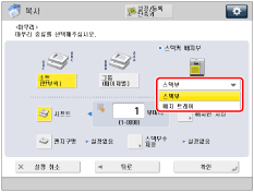 [스택커]를 선택할 경우 해당 작업의 출력 위치를 [스택부] 또는 [배지 트레이]로 변경할 수 있습니다. |