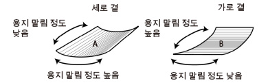 용지의 뻣뻣한 정도는 용지 입자의 방향에 따라 달라집니다. 용지는 입자와 평행한 방향으로 말리는 경향이 있습니다.
