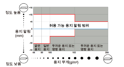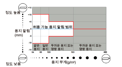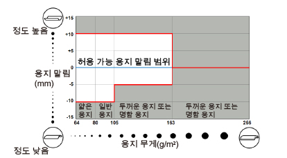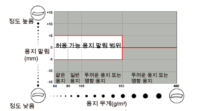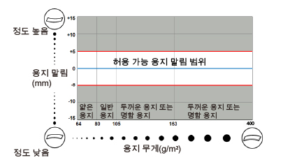 용지 두께에 관계없이 위나 아래로 5 mm 이하로 말리는 용지를 사용하는 것이 좋습니다.