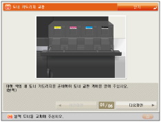 터치 패널 화면에서 [이전화면] 또는 [다음화면]을 눌러 토너 카트리지에 대한 모든 지침에 접근할 수 있습니다. 인쇄 작업 중에 토너를 교체해야 하는 경우, 토너 카트리지를 교체한 후에 남은 인쇄가 진행됩니다. 블랙 토너가 남아 있으면 흑백으로 복사 및 인쇄를 계속할 수 있습니다. 그러나 시안, 마젠타 또는 옐로우 토너가 소모되어 작업이 중단된 경우, 흑백 복사 및 인쇄는 중단된 작업에 사용 중인 기능 이외의 기능에 대해서만 가능합니다. 토너 카트리지 교체 후 인쇄된 컬러가 토너 카트리지를 교체하기 전에 인쇄한 컬러와 다른 경우, [조정/유지보수](설정/등록)의 [자동 계조 보정]을 수행하십시오. ("자동 계조 조정" 참고) |