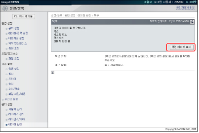 저장된 데이터에 대한 기본 정보는 "스캔하고 저장" 및 "저장 파일 이용"을 참고하십시오. 중요 데이터를 정기적으로 백업하는 것이 좋습니다. 백업된 데이터를 편집 또는 삭제하지 않아야 합니다. 백업된 데이터를 편집한 경우, 데이터를 올바르게 백업 또는 복구하지 못할 수 있습니다. 저장된 데이터를 백업/복구하려면 관리자로 로그인해야 합니다. |