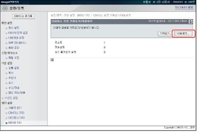 [디바이스 설정 (전송 설정, 주소록, 송신 즐겨찾기 설정)]를 <개별 가져오기/내보내기>에 대해 클릭하고 → [내보내기]를 클릭합니다.