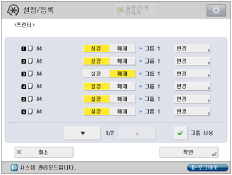 Long Sheet Tray-D이 장착된 경우 용지 바이패스에 대한 용지 카세트 자동 선택을 설정할 수 있습니다. ("Long Sheet Tray-D" 참고) Long Sheet Tray-D을 제외하고 최소한 하나의 용지 공급원을 '설정'으로 지정해야 합니다. [복사]를 선택하면 컬러 모드를 고려할지 여부를 설정할 수 있습니다. [컬러선택을 고려함]을 '설정'으로 지정한 경우, 컬러 모드에 따라 용지 공급원이 자동으로 선택됩니다(예: 컬러 복사 시 보통 용지 같은 컬러 복사용 용지가 선택되거나 흑백 복사 시 재생 용지 같은 흑백 복사용 용지가 선택됨). 자세한 내용은 "컬러에 따라 용지 카세트 자동 선택 지정"을 참고하십시오. [컬러선택을 고려함]을 '해제'로 지정한 경우, 컬러 모드에 따라 용지 공급원이 자동으로 선택되지 않습니다. [컬러선택을 고려함]을 ''설정'으로 지정하면 [용지종류를 고려함]도 '설정'으로 지정됩니다. [복사]를 선택하면 용지 종류를 고려할지 여부를 설정할 수 있습니다. [용지종류를 고려함]을 '설정'으로 지정하면 다른 용지 공급원에 동일한 크기와 종류의 용지가 없는 경우 원래의 용지 공급원에서 용지가 떨어졌을 때 다른 용지 공급원으로부터 용지가 급지되지 않습니다. 저장된 용지 종류에 대한 자세한 내용은 "소모품 상황 및 기타 정보 확인"을 참고하십시오. [용지종류를 고려함]을 '해제'로 지정하면 다른 용지 공급원에 동일한 크기의 용지가 있는 한, 현재의 용지 공급원에서 용지가 떨어졌을 때 다른 용지 공급원으로부터 용지가 급지됩니다. [생산성 중시]를 누른 경우, 용지가 완전히 없어지기 전에 급지위치가 자동으로 변경되어 용지 급지가 중단되지 않고 계속됩니다. [프린터]를 선택하면 용지 공급원의 그룹 설정 여부를 지정할 수 있습니다. [그룹 사용]을 '설정'으로 지정하면 용지 공급원이 그룹으로 설정됩니다. 프린터 드라이버에서 특정 용지 공급원을 선택한 경우 그룹에서 카세트 자동 전환이 실행됩니다. [그룹 사용]을 '해제'로 지정하면 용지 공급원이 그룹으로 설정되지 않습니다. 프린터 드라이버에서 특정 용지 공급원을 선택한 경우 카세트 자동 전환이 실행되지 않습니다. |