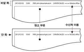발신원 기록은 송신 문서의 상단에 인쇄됩니다. 수신인이 수신에 대한 상세 정보를 확인할 수 있도록 I-팩스 주소 등의 정보가 인쇄됩니다.