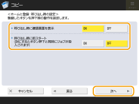 <呼び出し時に確認画面を表示>と<呼び出し時に即スタート(ONにするとボタン押下と同時にジョブが投入されます)>の設定を両方とも<ON>にすると、確認画面で<はい>を押したあとにコピーが実行されます。