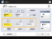 両面原稿を製本コピーする場合は<両面原稿>を押し、原稿に合わせて<左右開き>か<上下開き>かを選んでください。
