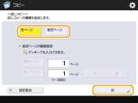 ページを指定して試しコピーする場合は、<指定ページ>を選びます。<開始ページ>または<終了ページ>を押してページを入力します。