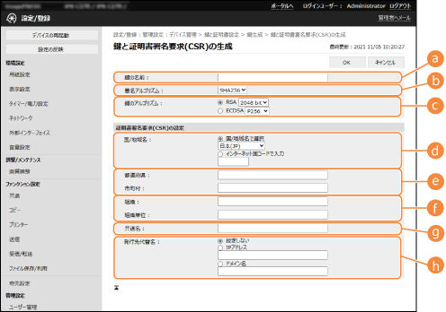 鍵とCSRを本機で生成します。CSRのデータは画面に表示されるほか、ファイルに出力することもできます。