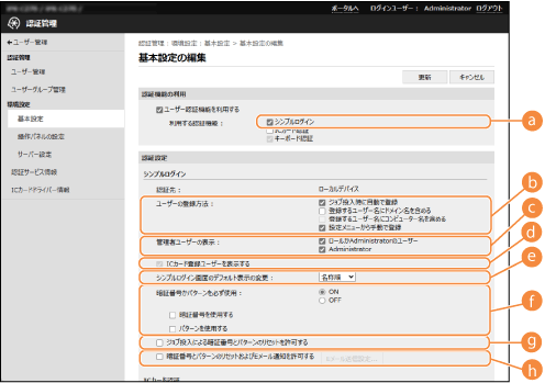 ICカード認証でログインするときに、暗証番号やパターンの入力を必須にする場合は、対象ユーザーを[すべてのユーザー]または[管理者ユーザーのみ]から選択し、[暗証番号を使用する]/[パターンを使用する]の片方または両方にチェックマークを付けます。
