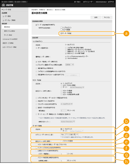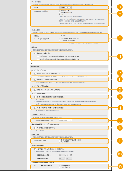 ローカルデバイスのユーザーによるログイン時のみ統合認証機能を使用できないようにするときは、[ローカルデバイス認証時の資格情報を利用した統合認証を無効にする]にチェックマークを付けます。