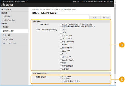 [認証が必要な機能を選択時にログイン画面を表示する]を選んだときは、ログイン画面を表示させる機能も合わせて選択してください。
