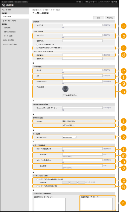 dc | × | 0文字以上32文字以内 | 制御文字 | - (なし) | 変更できません。以下の方法でユーザー登録された場合に自動付与されます。 サーバー認証後に登録されたユーザー シンプルログインの<ジョブ投入時に自動で登録>で登録されたユーザー |