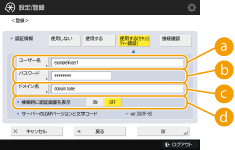 2 | ユーザー名とパスワードを入力し、必要な設定をする ![]() <ユーザー名>LDAPサーバーに登録された本機のユーザー名を入力します(入力例:「user1」)。 <パスワード>LDAPサーバーに登録されたパスワードを入力します。パスワードを入力すると、確認のために<確認入力>が表示されますので、再度パスワードを入力してください。 <ドメイン名>本機が所属しているドメイン名を入力します。 <検索時に認証画面を表示>宛先検索をするときに、ユーザー名とパスワードの入力画面を表示するときは<ON>を押します。 |