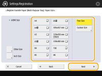 1 | Press <Custom Size>. ![]() You can specify the paper size as <Free Size>, which eliminates the need to enter the paper size setting. Specify <Free Size> when you load paper of unknown size to use for copying or when the paper size is already registered in the printer driver. |