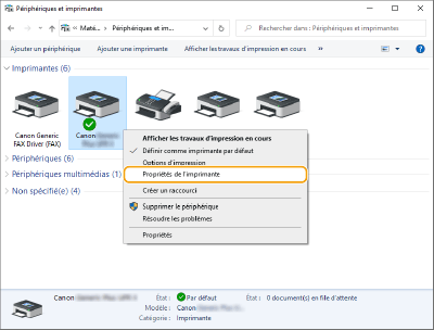 Cliquez avec le bouton droit sur l'icône imprimante de l'appareil, puis cliquez sur [Propriétés de l'imprimante].
