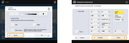 De plus, les touches comme <Annuler>, qui annulent le paramètre puis rétablissent l'écran précédent ; <Suivant>, qui appliquent le paramètre puis affichent l'écran suivant ; <Précédent>, qui rétablissent l'écran de paramétrage précédent ; et <Fermer>, qui ferme l'écran ouvert, s'affichent.