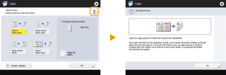 Selon la fonction affichée,  apparaît dans la partie supérieure droite de l'écran. Appuyez sur  pour consulter la description et le mode d'emploi de la fonction.