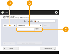 Enregistrement d'une copie d'un document envoyéVous pouvez définir la machine de manière à ce qu'une copie d'un document envoyé soit automatiquement enregistrée dans un serveur de fichier. La copie est convertie en un fichier électrique sous la forme d'un PDF et enregistrée, vous permettant de vérifier facilement le contenu depuis votre ordinateur. Enregistrer une copie d'un document envoyé Sélection d'un nom d'émetteurSur l'écran des fonctions de base de la fonction Fax, vous pouvez appuyer sur <Options> <Nom d'expéditeur (ITE)> pour pouvoir sélectionner un nom dans la liste des noms des expéditeurs enregistrés et ajouter des informations sur des expéditeurs. <Mémoriser Nom expéditeur(ITE)>En cas de connexion à l'aide de l'authentification utilisateur, le nom de connexion s'affiche dans <100> du Nom d'expéditeur (TTI). Vérification des images scannées avant l'envoiVous pouvez vérifier les images numérisées sur l'écran d'aperçu avant d'envoyer. Vérification des images numérisées avant l'envoi (Aperçu) Enregistrement des paramétrages fréquemment utilisésVous pouvez combiner des destinataires et des réglages de numérisation fréquemment utilisés dans un bouton de l'appareil pour une utilisation ultérieure. Pour faire rapidement vos réglages, il vous suffit d'appuyer sur le bouton enregistré lorsque vous numérisez des originaux. Enregistrement d'une combinaison pour les fonctions fréquemment utilisées |