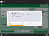Pour vérifier le nombre total de destinataires spécifiésLe nombre total de destinataires spécifiés est affiché en haut à droite de l'écran. Cela vous permet de vérifier que le nombre de destinataires est correct avant de faire l'envoi. ![]() Pour envoyer avec les informations d'émetteurVous pouvez envoyer le fax avec le nom et le numéro de fax de l'expéditeur. <ID terminal émetteur> Pour vérifier les statuts pour les documents envoyésA l'écran <Suivi statut>, vous pouvez vérifier les statuts pour les documents envoyés. Cet écran vous permet de renvoyer des fax ou d'annuler l'envoi après avoir vérifié les statuts. Vérification de l'état et du journal concernant les documents envoyés et reçus Lorsque <Afficher notification à l'acceptation de la tâche> est réglé sur <Oui>, l'écran <Suivi statut> peut s'afficher à partir de l'écran suivant qui apparaît après la réception d'une tâche. <Afficher notification à l'acceptation de la tâche> ![]() Si une erreur de transmission se produit parce que la ligne du destinataire est occupéeLa machine rappelle automatiquement au bout d'un certain temps. Vous pouvez modifier les paramètres tels que le nombre de fois que la machine rappelle et l'intervalle entre les rappels. <Recomposition auto> Pour imprimer le rapport pour les résultats d'envoiSur l'écran des fonctions de base de la fonction Fax, vous pouvez appuyer sur <Options> <Rapport TX> pour pouvoir configurer l'impression automatique du rapport listant les résultats de l'envoi.Pour définir cette option pour chaque tâche à partir des <Options>, il est nécessaire de sélectionner <Erreur seulement> ou <Non> dans <Rapport TX>, puis de définir <Autoriser impression dans Options> sur <Oui>. Si plusieurs feuilles sont alimentées en même tempsLa numérisation s'arrête et le message s'affiche à l'écran. Suivez les instructions pour éliminer le bourrage papier. Une fois le bourrage éliminé, l'écran de reprise du travail s'affiche. Si l'appareil détecte par erreur le chargement de plusieurs feuilles, appuyez sur <Ne pas détecter chargeur/alim. multi> pour recommencer la numérisation. Pour configurer l'appareil à l'avance de sorte qu'il ne signale pas le chargement de plusieurs feuilles, effectuez une des opérations suivantes. A chaque envoi, appuyez sur <Options> sur l'écran des fonctions de base de la fonction Fax sélectionnez <Détecter chrgr/alim. multiple> pour désactiver le réglage. Définissez <Activer détection alim. multi. par chargeur par défaut> sur <Non>. <Activer détection alim. multi. par chargeur par défaut> Lorsque des photos dans l'image envoyée sont trop sombres ou claires, les couleurs à l'arrière-plan des originaux en couleur ne peuvent être suppriméesLa qualité de l'image envoyée peut être améliorée si les conditions/paramètres suivants sont satisfaits. Type de tâche : Télécopie (envoi depuis la mémoire) ou Numérisation et envoi (Fax/I-fax) <Choisir couleur> : <Noir et blanc> (Numérisation et envoi) <Type d'original> : <Texte> <Densité> <Densité du fond> : <Auto><Résolution> : 200 ppp x 400 ppp, 300 ppp x 300 ppp*, 400 ppp x 400 ppp ou 600 ppp x 600 ppp* *Peut être défini pour Numérisation et envoi <Priorité vitesse/type d'image pour lecture N&B> Envois Fax/I-Fax : <Priorité qualité> (<Priorité vitesse/type d'image pour lecture N&B>)Lorsque plusieurs lignes téléphoniques sont définiesVous pouvez sélectionner la ligne téléphonique à utiliser pour envoyer des fax en appuyant sur <Options> <Sélection de la ligne>. Pour obtenir des instructions sur la spécification des réglages de ligne de fax, reportez-vous à la section Réglages de la ligne de fax. |