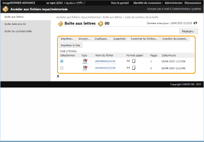 ![]() | Vous pouvez utiliser l'interface utilisateur distante pour imprimer, envoyer ou supprimer des fichiers qui sont stockés dans la boîte courrier ou des fax et I-faxes qui sont temporairement stockés dans la boîte courrier Fax/I-Fax. |