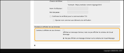Lorsque la fonction Visual Message est activée, le contenu peut être vérifié à partir de <Visual Message> sur le Accueil, quel que soit le moment indiqué. Le dernier contenu affiché est affiché. Définissez un fichier enregistré sur un serveur de fichiers ou dans une Espace avancé sur le même réseau que le contenu à afficher. Utiliser comme un simple serveur de fichier Vous pouvez également définir un site Web sur Internet comme contenu via un serveur proxy. Les réglages proxy utilisés pour cette fonction sont les mêmes que les réglages dans <Réglages Proxy>. Si un proxy est établi, le contenu spécifié peut ne pas apparaître. Lorsque cela se produit, établissez une adresse d’exception de sorte que le serveur proxy ne soit pas utilisé. Configuration d'adresses particulières n'utilisant pas un serveur proxy Le contenu est affiché lorsque l'impression démarre si la fonction d'impression en attente forcée est activée et la case [Afficher au démarrage de la tâche d'impression] est cochée. |