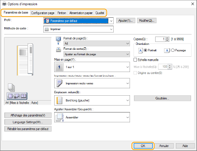 Spécifiez les réglages d'impression nécessaires et cliquez sur [OK].