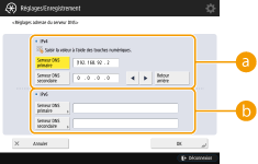 2 | Définissez les paramètres nécessaires. Selon votre environnement, saisissez l'adresse IP du serveur DNS. ![]() <IPv4>Appuyez sur <Serveur DNS primaire>, et saisissez l'adresse IPv4 du serveur DNS. Si un serveur DNS secondaire a été déployé, saisissez son adresse IP. Si vous ne configurez aucun serveur DNS secondaire, saisissez « 0.0.0.0 ». <IPv6>Appuyez sur <Serveur DNS primaire>, et saisissez l'adresse IPv6 du serveur DNS. Sont à proscrire les adresses commençant par « ff » (adresse multidiffusion), les adresses constituées uniquement de « 0 » ou les adresses Link-Local. Si un serveur DNS secondaire a été déployé, saisissez son adresse IP. Sont à proscrire les adresses commençant par "ff" (adresse multidiffusion), les adresses constituées uniquement de "0" ou les adresses Link-Local. Ce champ peut rester vierge. |