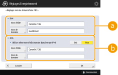 2 | Définissez les paramètres nécessaires. ![]() <IPv4>Appuyez sur <Nom d'hôte>, et saisissez le nom d'hôte de l'appareil afin de l'enregistrer sur le serveur DNS en utilisant des caractères alphanumériques. Appuyez sur <Nom de domaine>, puis saisissez le nom du domaine auquel appartient l'appareil, en utilisant des caractères alphanumériques (exemple : "exemple.fr"). <IPv6>Pour spécifier le même nom d'hôte et nom de domaine que ceux d'IPv4, appuyez sur <Oui> dans <Utiliser même nom d'hôte/nom de domaine que IPv4>. Pour spécifier un nom d'hôte et nom de domaine différents de ceux d'IPv4, appuyez sur <Non>. Pour spécifier un nom d'hôte différent de celui d'IPv4, appuyez sur <Nom d'hôte> et saisissez le nom d'hôte de l'appareil à enregistrer sur le serveur DNS en utilisant des caractères alphanumériques. Pour définir un nom de domaine autre qu'IPv4, appuyez sur <Nom de domaine>, puis saisissez le nom du domaine auquel appartient l'appareil, en utilisant des caractères alphanumériques (exemple : "exemple.fr"). ![]() Si vous définissez <Utiliser DHCPv6> sur <Oui> pour les réglages d'adresse avec état (Configuration d'une adresse IPv6), le nom de domaine configuré manuellement est écrasé. Si vous définissez <Utiliser même nom d'hôte/nom de domaine que IPv4> sur <Oui>, le nom de domaine qui est extrait du serveur DHCPv6 est utilisé. |