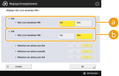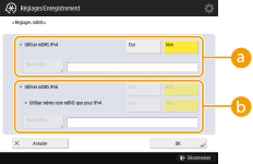 2 | Définissez les paramètres nécessaires. ![]() <IPv4>Pour mettre automatiquement les informations à jour lorsque la correspondance entre le nom d'hôte et l'adresse IP est modifiée, par exemple dans un environnement DHCP, appuyez sur <Oui> dans <Mise à jour dynamique DNS>. <IPv6>Pour mettre automatiquement les informations à jour lorsque la correspondance entre le nom d'hôte et l'adresse IP est modifiée, par exemple dans un environnement DHCP, appuyez sur <Oui> dans <Mise à jour dynamique DNS>. Sélectionnez <Oui> pour l'adresse que vous souhaitez enregistrer pour le serveur DNS dans <Mémoriser une adresse sans état>/<Mémoriser une adresse manuelle>/<Mémoriser une adresse avec état>. Veuillez noter que la mise à jour automatique ne peut pas s'exécuter si toutes ces options sont réglées sur <Non>. |