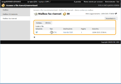 Si possono stampare o eliminare i fax e I-fax che sono momentaneamente memorizzati nella Mailbox fax riservati.