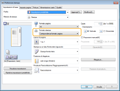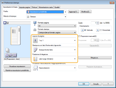 Controllando l'anteprima di stampa, impostare [Layout di pagina] [Ordine delle pagine] [Stampa su un lato/fronte-retro/opuscolo] [Posizione di rilegatura].